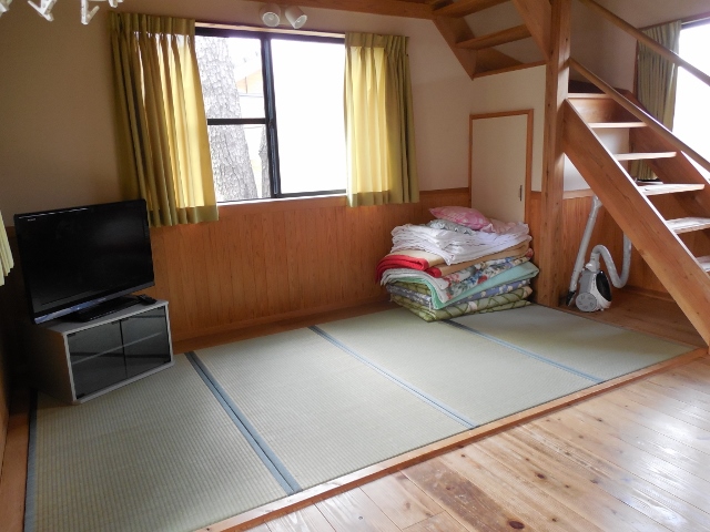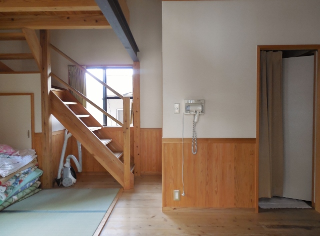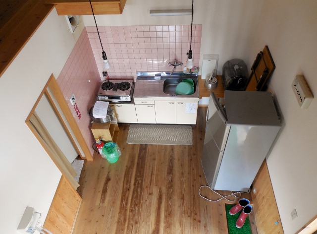 2014/05/22 Category : 施設案内 ログハウスの話 こんにちは‼ 昨日の雨が嘘みたいに今日は天気が良いですね。 毎回言ってますが本当暑いです 夏が恐ろしいです。 さて本日は大人気の③ログハウスについて書いていきます‼ ログハウスは全部で6部屋あり、2つずつ部屋が隣接しています。 玄関↓ 正面がこのようになっていて 右手の扉がお風呂、トイレです。 左側にはテレビ、布団が置いてあります。 右手にある階段を上るとロフトになっています。 ロフトから見た台所↓ エアコン完備 後ちょっと大きめの冷蔵庫も付いていますので長期の滞在にも良いですね‼ ログハウス(1~4人)1泊素泊まり 14,000円~※最大6人まで宿泊できます。※1人追加2,000円(寝具あり)6人以上は追加1人500円(寝具なし) 夏場は予約が混み合いますのでお早目の予約をおすすめします‼